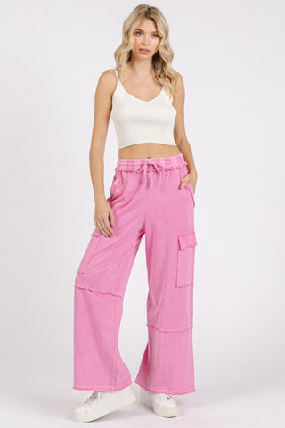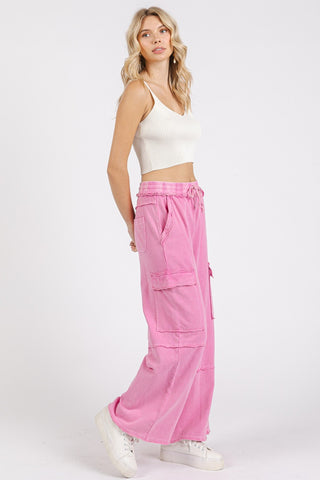 Mineral wash elastic waist cargo wide leg pants are comfortable and stylish pants made from a mineral wash fabric, giving them a vintage and worn-in look. The elastic waistband ensures a comfortable and adjustable fit, while the cargo style features multiple pockets for added utility and a casual vibe. The wide leg cut provides a relaxed and flowy silhouette, making these pants perfect for a laid-back and fashionable outfit. They are versatile and can be paired with a variety of tops for a trendy and effortless look.